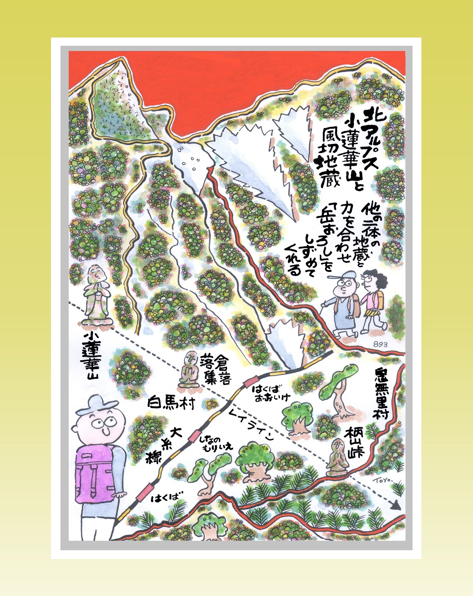 山頂と、ふもとの白馬村落倉集落の風切地蔵、そして柄山(からやま)峠