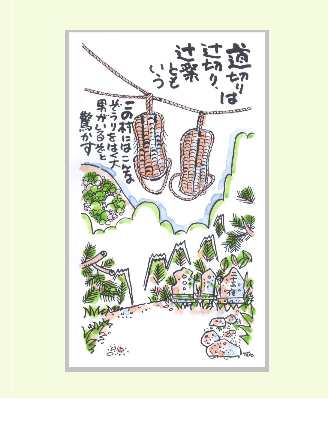 山村を歩いていると村の入口や辻に縄を張って大きな草履をぶら下